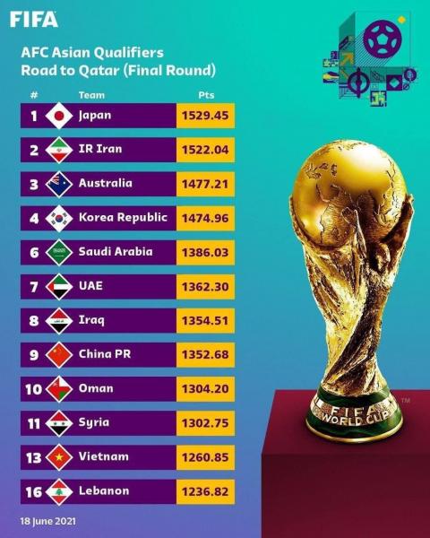 به گزارش تابناک ورزشی، سایت فدراسیون جهانی فوتبال (فیفا) ردهبندی تیمهای ملی آسیایی حاضر در مرحله پایانی انتخابی جام جهانی ۲۰۲۲ قطر را اعلام کرد که بر مبنای آن، سیدبندی مسابقات مشخص شد.
