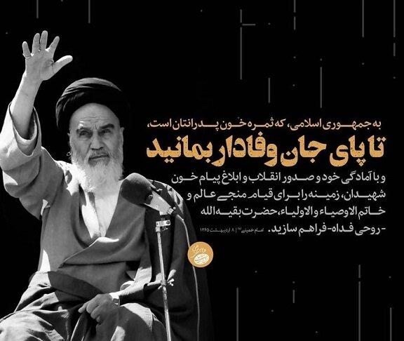 امام راحل در ادامه نوشتند: «اینک که به توفیق و تأیید خداوند، جمهوری اسلامی با دست توانای ملت متعهد پایهریزی شده، و آنچه در این حکومت اسلامی مطرح است اسلام و احکام مترقی آن است، بر ملت عظیمالشأن ایران است که در تحقق محتوای آن به جمیع ابعاد و حفظ و حراست آن بکوشند که حفظ اسلام در رأس تمام واجبات است، که انبیای عظام از آدم ـ علیه السلام ـ تا خاتمالنبیین ـ صلیاللّه علیه و آله و سلم ـ در راه آن کوشش و فداکاری جان فرسا نمودهاند و هیچ مانعی آنان را از این فریضۀ بزرگ باز نداشته و همچنین پس از آنان اصحاب متعهد و ائمۀ اسلام ـ علیهم صلوات اللّه ـ با کوششهای توان فرسا تا حد نثار خون خود در حفظ آن کوشیدهاند و امروز بر ملت ایران، خصوصاً، و بر جمیع مسلمانان، عموماً، واجب است این امانت الهی را که در ایران به طور رسمی اعلام شده و در مدتی کوتاه نتایج عظیمی به بار آورده، با تمام توان حفظ نموده و در راه ایجاد مقتضیات بقایآن و رفع موانع و مشکلات آن کوشش نمایند و امید است که پرتو نور آن بر تمام کشورهای اسلامی تابیدن گرفته و تمام دولتها و ملتها با یکدیگر تفاهم در این امر حیاتی نمایند و دست ابرقدرتهای عالمخوار و جنایتکاران تاریخ را تا ابد از سر مظلومان و ستمدیدگان جهان کوتاه نمایند.»