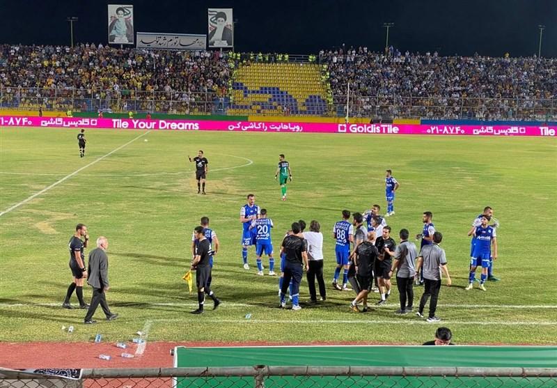 پرتاب ترقه و بطری به زمین توسط هواداران استقلال سبب شد داور مسابقه، بازی را حدود یک دقیقه تعطیل کند.
