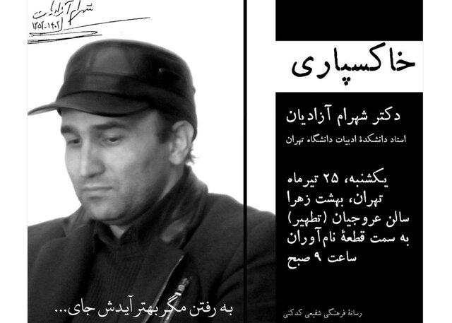 به گزارش ایسنا، صفحه منسوب به محمدرضا شفیعی کدکنی با اشتراک گذاشتن اطلاعیهای نوشته است: «مراسم تشییع پیکر و خاکسپاری دکتر شهرام آزادیان، استاد دانشکده ادبیات دانشگاه تهران روز یکشنبه، ۲۵ تیرماه از ساعت ۹ صبح در بهشت زهرا از سالن عروجیان (تطهیر) به سمت قطعه نامآوران برگزار خواهد شد.»