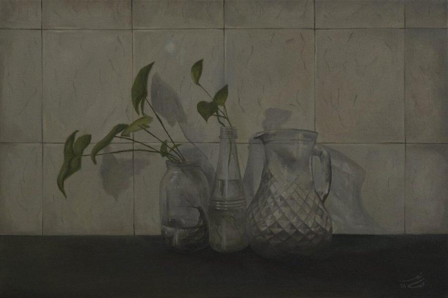 گرته روشنی مرده نوری تمام نقاشی ها را به رنگ خود درآورده است تا ماهیت بیرونی اشیا به سختی قابل دیدن شود. انتخاب گلدانی در تاریکی، انتظار نور را معنا ببخشد و یا گنگی تصویر پشت پنجره ای که می تواند انتظاری را رقم بزند. و پرده ای که هنوز نیفتاده است.