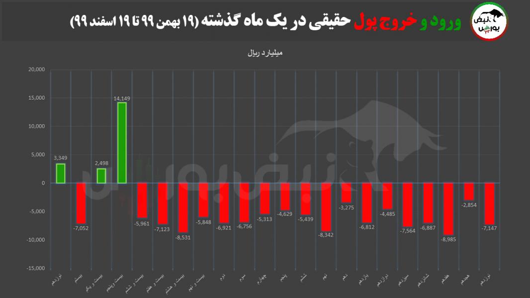 همچنین برای هجدهمین روز متوالی شاهد خروج پول حقیقی از بازار بودیم که برای خود یک رکورد محسوب میشود.