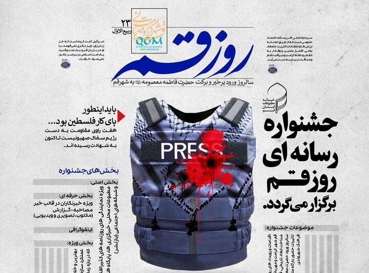 دبیر جشنواره رسانهای روز قم با اشاره به پوستر ویژه این جشنواره عنوان کرد: پوستر جشنواره رسانهای روز قم با نمادی از خبرنگاران شهید فلسطینی که در حمله بی رحمانه رژیم کودک کش و غاصب صهیونیستی شهید شدند طراحی شده است و این پوستر پیغامی است از سوی جامعه رسانه و فرهیخته قم به سایر جوامع که اهالی هنر و رسانه با قلم و اندیشه خود یاری رسان ملت مظلوم و مقاوم فلسطین میباشند.