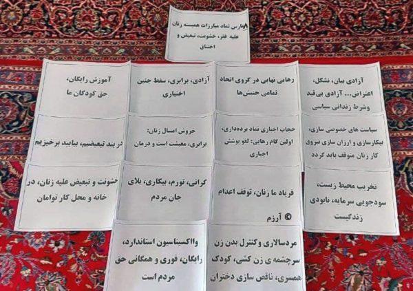 حق آموزش رایگان، همگانی و بهدور از تبعیض و خشونت، حق کنترل باروری و اعتراض علیه سلب حق سرپناه زنان حاشیهنشینی چون «آسیه پناهی» از جمله پوسترهای در دست این فعالان بود.