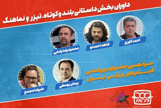 به گزارش خبرگزاری مهر به نقل از روابط عمومی جشنواره، با حکم سیدمجتبی علوی دبیر و عبدالحمید احمدی رئیس شورای سیاستگذاری جشنواره فیلم های ورزشی ایران، احمد کاوری بازیگر و کارگردان، شاهد احمدلو بازیگر و کارگردان، پیمان یوسفی مجری، گزارشگر ورزشی و تهیه کننده تلویزیون، محمودرضا رضایی تهیهکننده، کارگردان و مدیر سابق امور رسانهای تیم ملی فوتبال ایران و علیرضا مجمع منتقد سینما به عنوان اعضای هیات داوران سیزدهمین جشنواره بینالمللی فیلمهای ورزشی ایران در بخش فیلم داستانی بلند و کوتاه، تیزر و نماهنگ معرفی شدند.