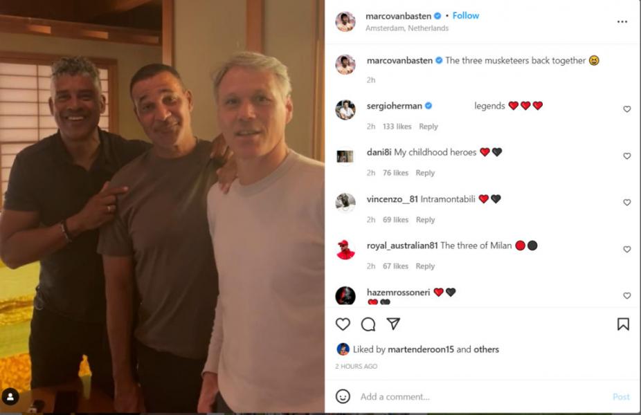 "این سه فوق ستاره هلندی از سال ۱۹۸۸ تا ۱۹۹۳ در سن سیرو به میدان رفته و بهترین روزهای باشگاه میلان را رقم زدند"اما با این حال این مهاجم بزرگ موفق شد ۱۲۵ گل در ۲۰۱ بازی به ثمر برسانده و ۴۹ پاس گل نیز بدهد. حالا فان باستن تصویری از خودش و دو ستاره هلندی دیگر میلان با این متن به اشتراک گذاشته است؛ "سه تفنگدار کنار هم برگشتند."