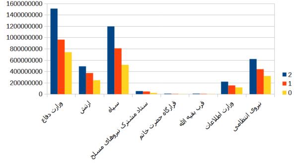 دو سالهوزارت دفاع۱۵۰۹۵۱۹۶۱۸۵۵۷۷۴۰۲۷۱۰۳ارتش۴۹۰۵۵۳۷۲۵۱۳۲۲۴۵۰۳۱۰۰سپاه۱۱۹۴۴۰۸۰۸۶۶۴۸۵۱۶۵۴۱۳۱ستاد کل مشترک نیروهای مسلح۵۳۵۲۴۵۹۷۱۶۲۱۰۹۱۵۴قرارگاه حضرت خاتم۹۱۴ میلیارد۵۰۰ میلیارد۷۷۳۶۰ میلیارد۱۴۸قرب بقیه الله۸۸۶ میلیارد۵۶۸ میلیارد۵۶۳۹۵ میلیارد۱۲۴وزارت اطلاعات۲۱۹۸۴۱۵۳۷۵۴۳۱۱۷۹۴۸۶نیروی انتظامی۶۲۰۰۰۴۳۹۶۷۴۱۳۲۰۰۵۹۴جمع کل۴۱۰۵۸۷۲۷۹۳۴۷۴۷۱۹۶۸۶۹۱۰۸٬۵جدول شماره یک: بودجه نهادهای نظامی.