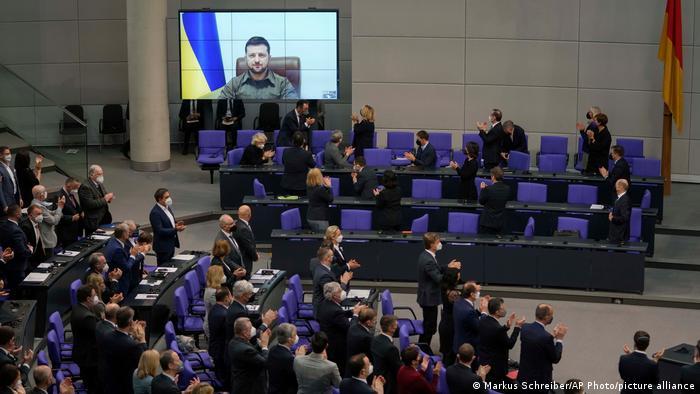 زلنسکی گفت آلمان به اندازه کافی برای جلوگیری از جنگ تلاش نکرد. رئیسجمهور اوکراین افزود، آلمان به ساخت دیواری برای منزوی ساختن اوکراین و تحویل آن به روسیه کمک کرده است. زلنسکی در پایان سخنرانی دهدقیقهای خود مستقیم اولاف شولتس، صدراعظم آلمان را خطاب قرار داد و گفت: «این دیوار را خراب کنید، از ما حمایت کنید.»
