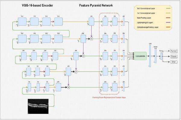 استاد دانشگاه تهران افزود: در این طرح، الگوریتمی نوین طراحی شده است که از یک ساختار کانولوشنی چند مقیاسه مبتنی بر شبکههای هرمی ویژگی برای جداسازی افراد سالم و دو حالت بیماری یعنی در وزن و نئواسکولاریزاسیون کروئیدی بهره میبرد. این شبکهها در کاربردهای بخشبندی تصاویر و تشخیص اشیاء مورد استفاده قرار گرفتهاند؛ اما در این پژوهش، با انجام تغییرات ساختاری، آنها را برای طبقهبندی مورد استفاده قرار دادهایم. استفاده از ساختار چند مقیاسه در طراحی این شبکه باعث میشود تا ویژگیهای غیرقابل تشخیص در یک مقیاس، در مقیاسی دیگر بررسی شوند که موجب افزایش دقت طبقهبندی میشود.