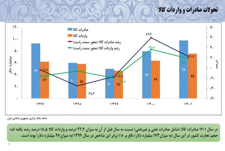 همچنین گفتنی است صادرات کالای کشور قبل از تحریم های ترامپ ۹۲ میلیارد دلار بود که این میزان در سال ۱۴۰۱ به ۹۷ میلیارد دلار رسیده است. همچنین صادرات غیرنفتی کشور از ۳۵ میلیارد دلار در سال ۹۷ به ۴۲ میلیارد دلار در سال ۱۴۰۱ رسیده است.