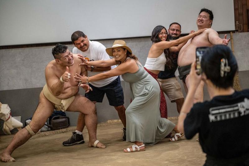گردشگران پس از ناهار میتوانند با کشتیگیران عکس سلفی بگیرند و لباسهای سومو بپوشند.