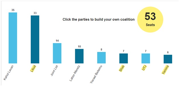 و ائتلاف چپگرایانی که انتظار میرود با توجه به دو انتخاب پیشین با رقیب اصلی نتانیاهو یعنی حزب آبی-سفید ائتلاف کنند (آبی-سفید، لیست مشترک عربی و ائتلاف حزب کارگر) عبارت است از ۵۹ کرسی که تنها ۲ کرسی تا پیروزی کم دارند.