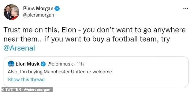 او در واکنش به توییت ایلان ماسک نوشت:" در این مورد به من اعتماد کن ایلان. تو حتی نباید نزدیک آنها (منچستریونایتد) هم بشوی. اگر میخواهی یک تیم فوتبال بخری، آرسنال را امتحان کن."