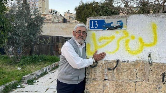 تصویر یکی از اهالی فلسطینی منطقه شیخ جراح در کنار دیوار نوشتهای که میگوید: "ما از اینجا نخواهیم رفت."