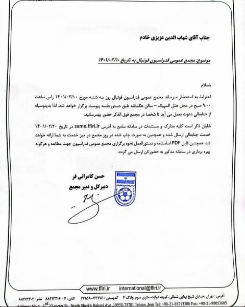 رئیس برکنار شده فدراسیون فوتبال با انتشار دو نامه، نشان داد ابتدا به مجمع فدراسیون فوتبال در روز سهشنبه، دهم خردادماه که در محل هتل المپیک برگزار میشود، دعوت شده ولی امروز حسن کامرانیفر طی یک نامهای دیگر او را از حضور در مجمع منع کرده است.
