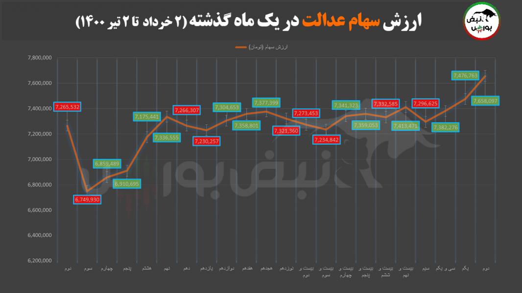 "ارزش سهام عدالت چقدر شد؟ در پایان معاملات دیروز بازار سهام، ارزش سهام عدالت به ۷ میلیون و ۶۵۸ هزار و ۹۷ تومان رسید که نسبت به روز معاملاتی گذشته ۲.۴ درصد معادل ۱۸۱ هزار و ۳۳۴ تومان افزایش داشت"بلافاصله پس از انتشار گزارش میزان ذخایر انبارهای نفت آمریکا، که نشان میداد ذخایر نفت این کشور ۷.۶ میلیون بشکه افت کرده است، قیمت شاخص برنت تا ۷۶.۰۲ دلار و قیمت نفت آمریکا تا ۷۴.۲۵ دلار هم بالا رفته بود. همچنین اداره اطلاعات انرژی آمریکا گزارش داد، هفته گذشته میزان تقاضای بنزین این کشور هم بالا رفته است.