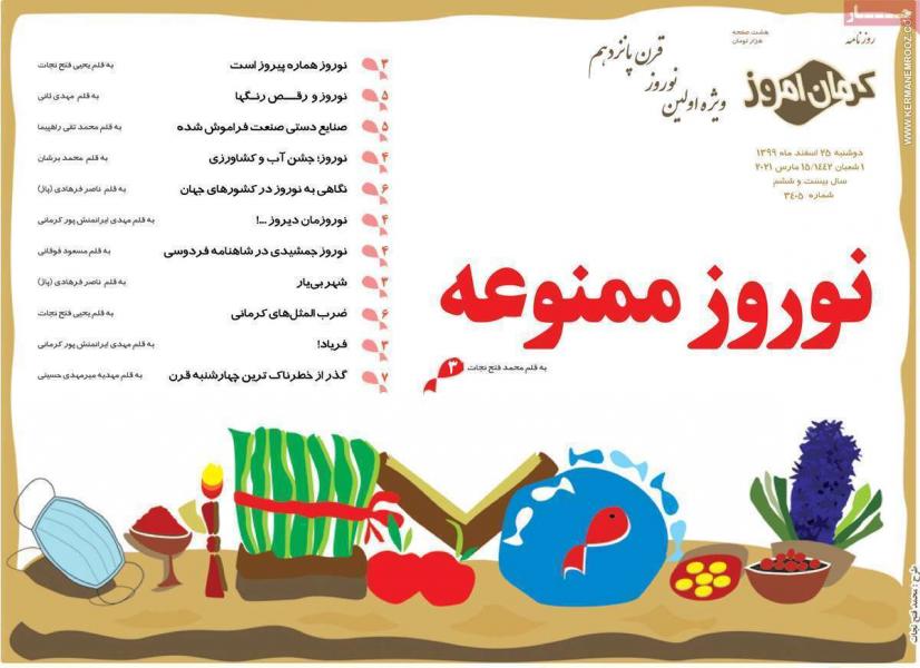 در روزنامه کرمان امروز با تیتر نوروز ممنوعه به بیماری کرونا و رعایت فاصله اجتماعی و دوری از دورهمی ها اشاره دارد.
