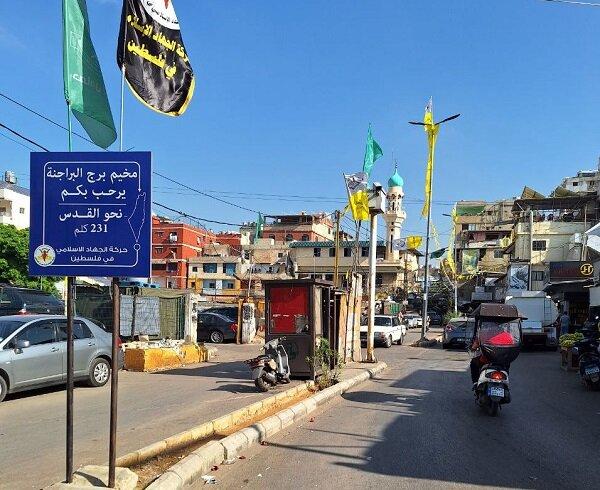 "در آن زمان روستایی در بیروت به نام برج البراجنه وجود داشته که بعدها اردوگاه آوارگان فلسطینی نیز در همین منطقه ساخته میشود"تابلویی که پرچمهای جنبش مقاومت اسلامی حماس و جنبش جهاد اسلامی فلسطین در کنار یکدیگر بر فراز آن به اهتزاز درآمده است. بر روی تابلو نیز نوشته شده است: به اردوگاه برج البراجنه خوش آمدید؛ ۲۳۱ کیلومتر مانده به قدس!