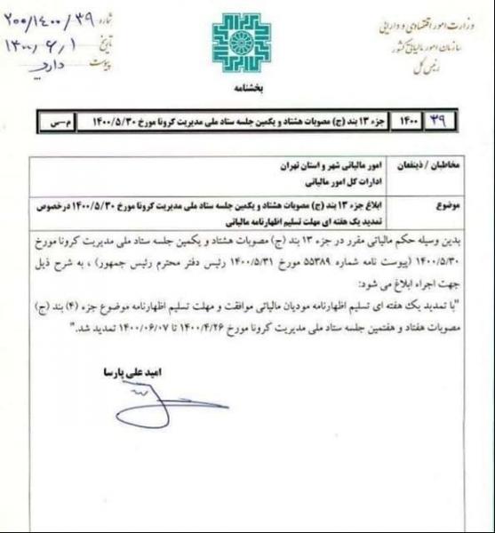 در این ابلاغیه که مورخ یک شهریور ماه سال جاری صادر شده آمده است: بدین وسیله حکم مالیاتی مقرر در جزء ۱۳ بند ج مصوبات هشتاد و یکمین جلسه ستاد ملی مدیریت کرونا مورخ ۱۴۰۰.۵.۳۰ پیوست نامه شماره ۵۵۳۸۹ مورخ ۱۴۰۰.۵.۳۱ رئیس دفتر محترم رئیس جمهور، به شرح ذیل جهت اجرا ابلاغ میشود: