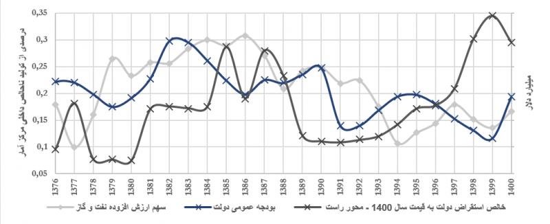 درآمدهای نفتی از دیرباز منبع اصلی درآمد دولت در ایران بوده است. با اوج گرفتن قیمت نفت در سال ۱۳۸۶، ارزش افزوده نفت و گاز در آن سال ۳۰.۷ درصد از تولید ناخالص داخلی ایران را تشکیل میداد (نمودار ۱). پس از تشدید تحریمها توسط جامعه بینالملل، سهم نفت از تولید ناخالص داخلی ایران به میزان قابل توجهی کاهش یافت و در سال ۱۳۹۴ به ۱۰.۶ درصد رسید. همانطور که نمودار ۱ نشان می دهد، بودجه عمومی دولت نسبت به تولید ناخالص داخلی طی دوره ۱۳۷۶-۱۴۰۰ با فاصله کمی از سهم نفت و گاز در تولید ناخالص داخلی حرکت میکند.