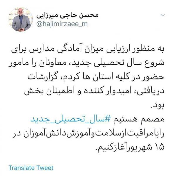 به گزارش مهر، محسن حاجی میرزایی وزیر آموزش و پرورش در توییتی نوشت: به منظور ارزیابی میزان آمادگی مدارس برای شروع سال تحصیلی جدید، معاونان را مامور حضور در کلیه استانها کردم، گزارشات دریافتی، امیدوار کننده و اطمینان بخش بود.
