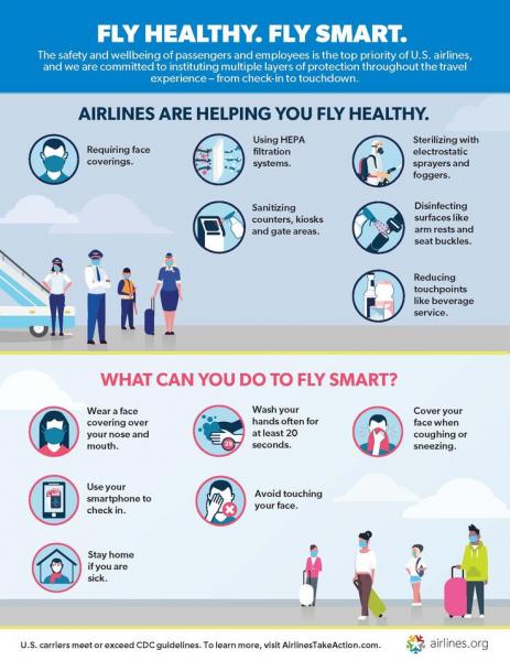 شرکتهای هواپیمایی آمریکن و یونایتد مدتها است مسافران را به داشتن ماسک تشویق میکنند تا از شیوع ویروس کرونا در پروازها جلوگیری کنند. بعضی از شرکتهای هواپیمایی، از جمله «جت بلو» با خالی نگه داشتن صندلی میانی در هواپیماها، میکوشند فاصلهگیری اجتماعی را در داخل هواپیما تا حدودی رعایت کنند.