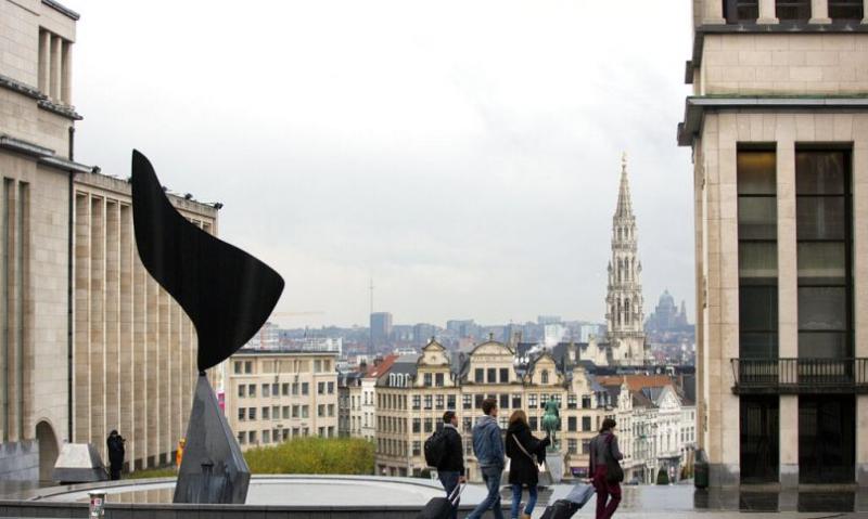 People walk with luggage with the city of Brussels as a backdrop, November ۲۰۱۵