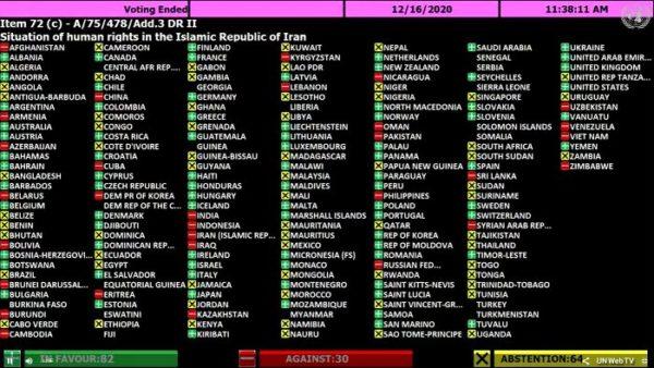 مجمع عمومی سازمان ملل در نشست روز چهارشنبه ۱۶ دسامبر ۲۰۲۰/ ۲۶ آذر ۹۹، در قطعنامهای با ۸۲ رأی موافق، ۳۰ رأی مخالف و ۶۴ رأی ممتنع، نقض حقوق بشر در ایران را محکوم کرد.