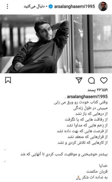 ارسلان قاسمی، ایفاگر نقش محسن در سریال «یاور» که در شب های ماه مبارک رمضان از شبکه سه سیما پخش میشود در جدیدترین فعالیت مجازی خود پستی را منتشر کرده و نوشته است: