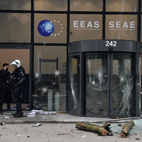 "به گزارش «تابناک» به نقل از اسپوتنیک، معترضان سعی کردند با استفاده از سنگ و چوب وارد دفتر مرکزی سرویس اقدام خارجی اروپا در پایتخت بلژیک شوند"برخی از معترضان با پلیس درگیر میشوند و از سوی دیگر پلیس سعی میکند با گاز اشک آور با تظاهرکنندگان مقابله کند.
