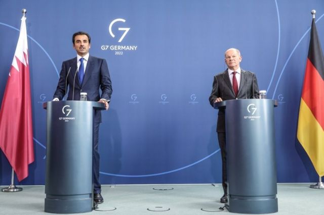 کنفرانس خبری اولاف شولتس، صدر اعظم آلمان و شیخ تمیم بن حمد آل ثانی، امیر قطر در برلین
