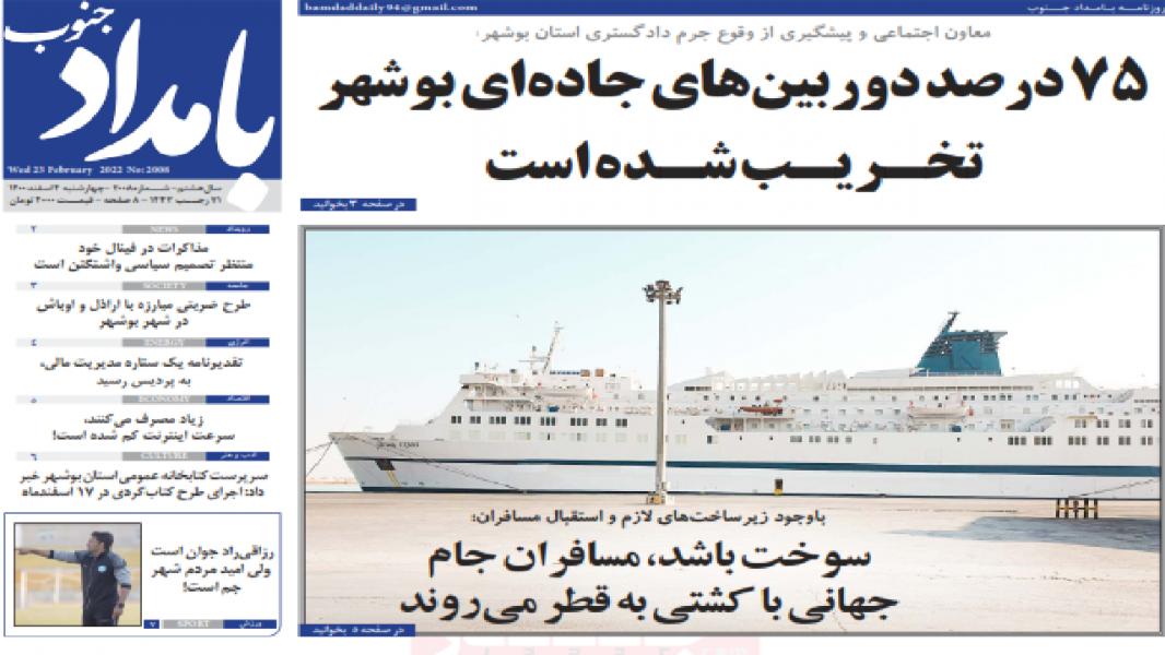 روزنامه بامداد جنوب با تیتر "سوخت باشد، مشافر جام جهانی با کشتی به قطر میرود" و روزنامه پیام عسلویه با تیتر "بازگشت ۲۷ سال حق تضییع شده کارگران مناطق ویژه و آزاد" منتشر شدند.