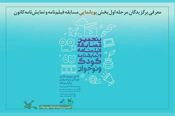 به گزارش خبرگزاری مهر به نقل از اداره کل روابط عمومی و امور بینالملل کانون، هیأت انتخاب بخش پویانمایی پنجمین مسابقه فیلمنامه و نمایشنامه کودک و نوجوان کانون پرورش فکری متشکل از کریم سربخش، حمیدرضا حافظی و علی نوریاسکوئی پس از بازبینی ۱۹۴ فیلمنامه پویانمایی، ۱۹ اثر را به عنوان برگزیده مرحله اول این رویداد هنری معرفی کردند.