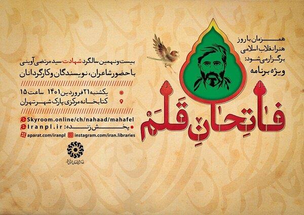 به گزارش خبرگزاری مهر، ویژه برنامه «فاتحان قلم» روز یکشنبه ۲۱ فروردین ماه و همزمان با بیست و نهمین سالگرد شهادت سید مرتضی آوینی و روز هنر انقلاب اسلامی، با حضور جمعی از شاعران، نویسندگان و کارگردانان و مسئولان نهاد کتابخانههای عمومی کشور در کتابخانه مرکزی پارکشهر تهران برگزار شد.