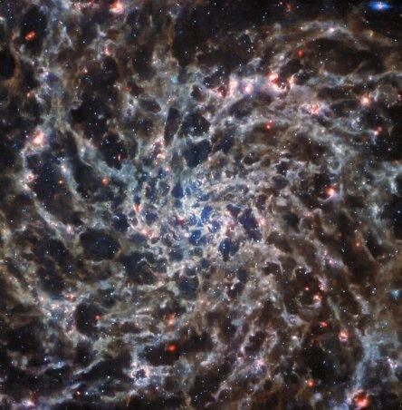 تصویر هابل مناطق تاریکی را نشان میدهد که به نظر میرسد بازوهای مارپیچی را از هم جدا میکنند، در حالی که تصویر جیمز وب یک شکل درهم تنیده از ساختار کهکشان را نشان میدهد.