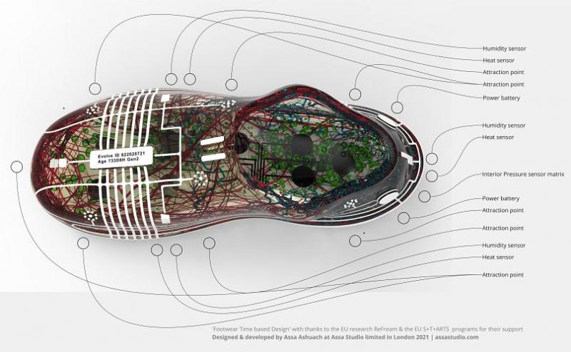 The Evolve AI shoes are fitted with a 3D-printed circuit board, which contains data-collecting sensors. This EU-funded project is a collaboration between multiple companies, including Assa Ashuach's studio, Stratasys, Haratech, and Profactor.