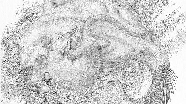 این فسیل یک پستاندار شبیه به گورکن را نشان میدهد که حدود ۱۲۵ میلیون سال پیش به یک دایناسور گیاهخوار حمله کرده و در حالی که به دور آن پیچیده، دندانهایش را در دندههای قربانی فرو برده است.