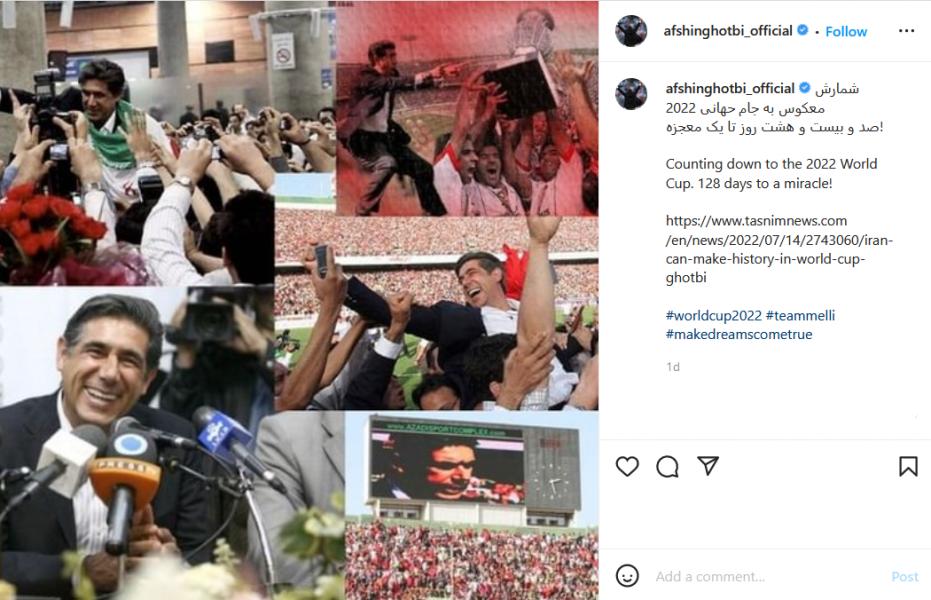 تنها هدف من ایجاد ایمان و ذهنیت مثبت و حمایت در تیم ملی است. درحالیکه ۱۲۷ روز تا بازی با انگلیس باقی مانده و جو منفی حول تیم ملی شکل گرفته، ما به ایمان، همبستگی و اتحاد نیاز داریم.