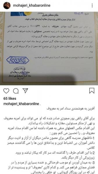 محمد مهاجری، فعال رسانه ای اصولگرا در واکنش به مجوز صادر شده برای علی اکبر رائفی پور توسط ستاد امر به معروف و نهی از منکر در اینستاگرام نوشت:
