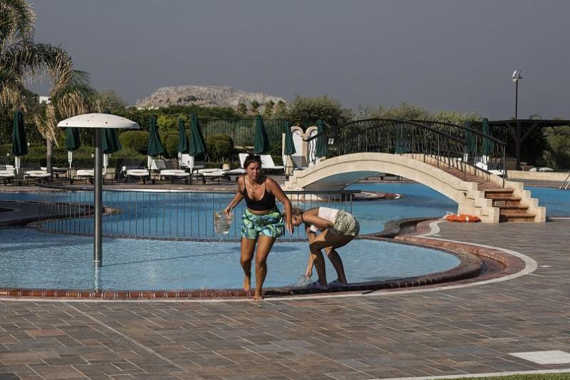 German tourists take water from a swimming pool of a hotel as they try to extinguish a fire near the seaside resort of Lindos, on the Aegean Sea island of Rhodes