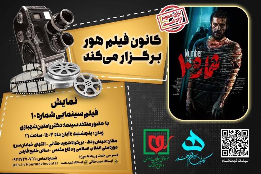 اولین جلسه اکران و نقد فیلم روز پنجشنبه ۴ آبان ماه ۱۴۰۲ ساعت ۱۶ در کانون فیلم هور به نشانی میدان ونک، بزرگراه شهید حقانی، خیابان سرو، ضلع جنوبی ایستگاه مترو شهید حقانی، موزه ملی انقلاب اسلامی و دفاع مقدس، سالن همایشهای بین المللی خلیج فارس به نقد و بررسی فیلم «شماره ۱۰» به کارگردانی حمید زرگرنژاد با حضور رامتین شهبازی نویسنده و منتقد سینما اختصاص یافته است که حضور برای عموم علاقهمندان آزاد است.