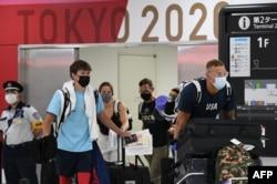 اعضای تیم شنای آمریکا هنگام ورود به ژاپن برای بازیهای المپیک
