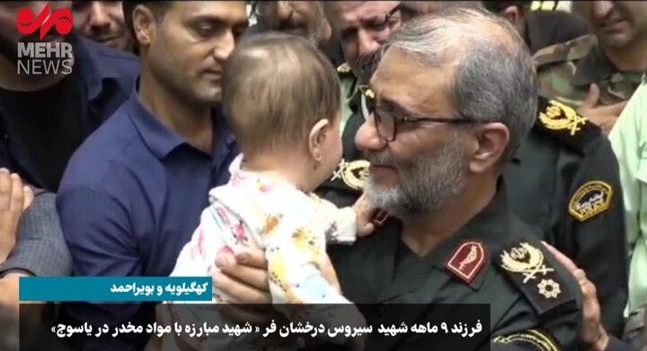 فرزند ۹ ماهه شهید درخشان فر در آغوش جانشین فرمانده ناجا