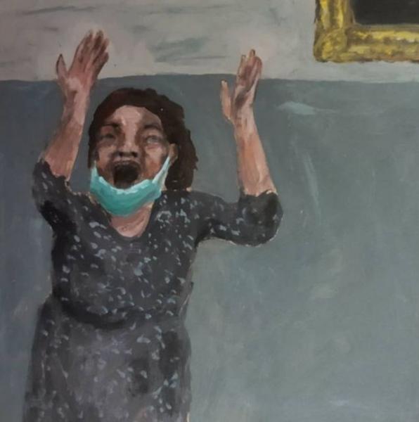 در بخش دیگری این صورتگر کلمه نوشته: میبینم کودکی ایستاده و ماسک صورتیاش را توی دست گرفته و آب میخورد از شیری و مادرش غر میزند که عجله کند. میگویم چه خوب دلم برای بچههای توی پارک تنگ شده بود و بچه میخندد و زن میگوید: دیوانه شده توی خانه، به درودیوار زده از تاریکی و بیبرقی، گناه دارند این بچهها.