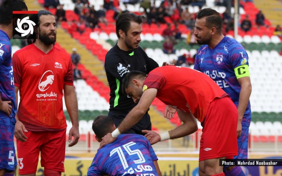 * اعلام پنالتی به سود هوادار در دقایق نخست نیمه اول با اعتراض شدید تراکتوری ها همراه بود.