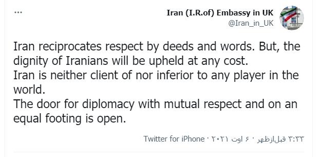 در ادامه سفارت ایران با تاکید بر اینکه جمهوری اسلامی مشتری و فرمانبردار هیچ بازیگری در جهان نیست تاکید کرد که باب دیپلماسی بر اساس احترام متقابل و در شرایط برابر باز است.