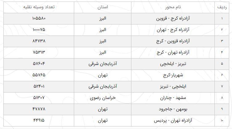 محورهای دارای بیشترین تردد طی ۲۴ ساعت گذشته: