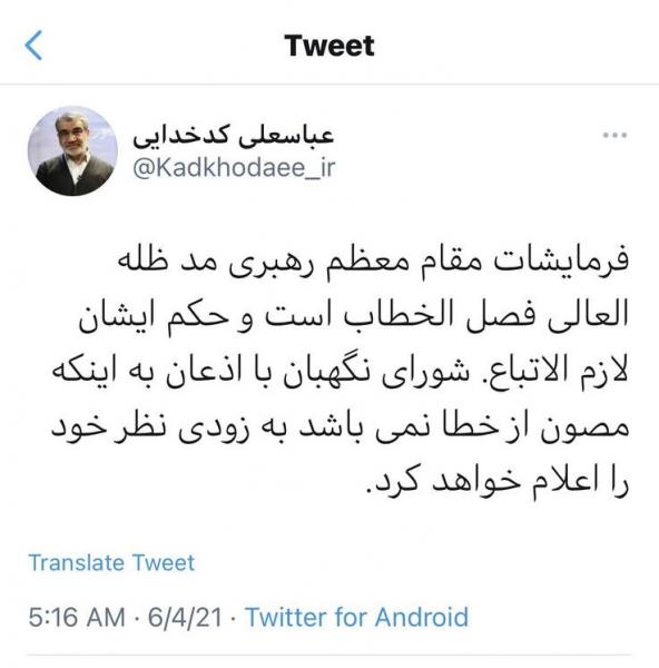 سخنگوی شورای نگهبان نیز در توئیتی سخنان خامنهای را «فصلالخطاب» و «حکم» او را «لازمالاتباع» خوانده و نوشته بود: «شورای نگهبان مصون از خطا نیست.»