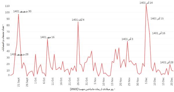 "نمودار شماره یک مجموع تجمعات و اعتصابات مردمی، دانشجویی، دانشآموزی، کارگری، بازاریان و اصناف را از زمان قتل مهسا (ژینا) امینی، یعنی ۲۵ شهریور تا ۳۰ آذر ۱۴۰۱، نشان میدهد"پس جنبش از تب و تاب نیافتاده است.