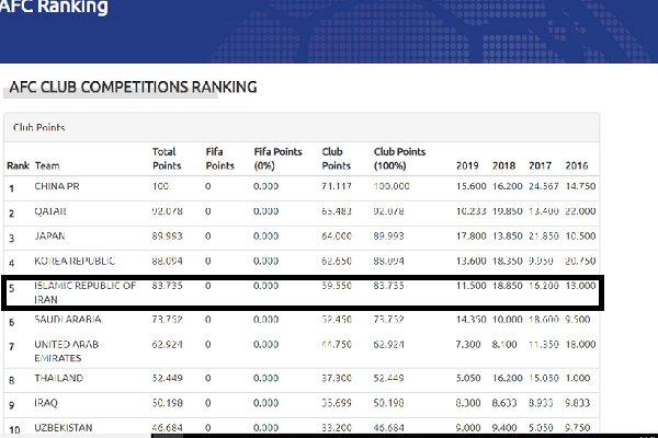 رده پنجم این رده بندی نیز به لیگ برتر فوتبال ایران اختصاص پیدا کرده است. فوتبال ایران ۸۳/۷۳۵ امتیاز کسب کرد تا دومین باشگاه در منطقه غرب آسیا شناخته شود.